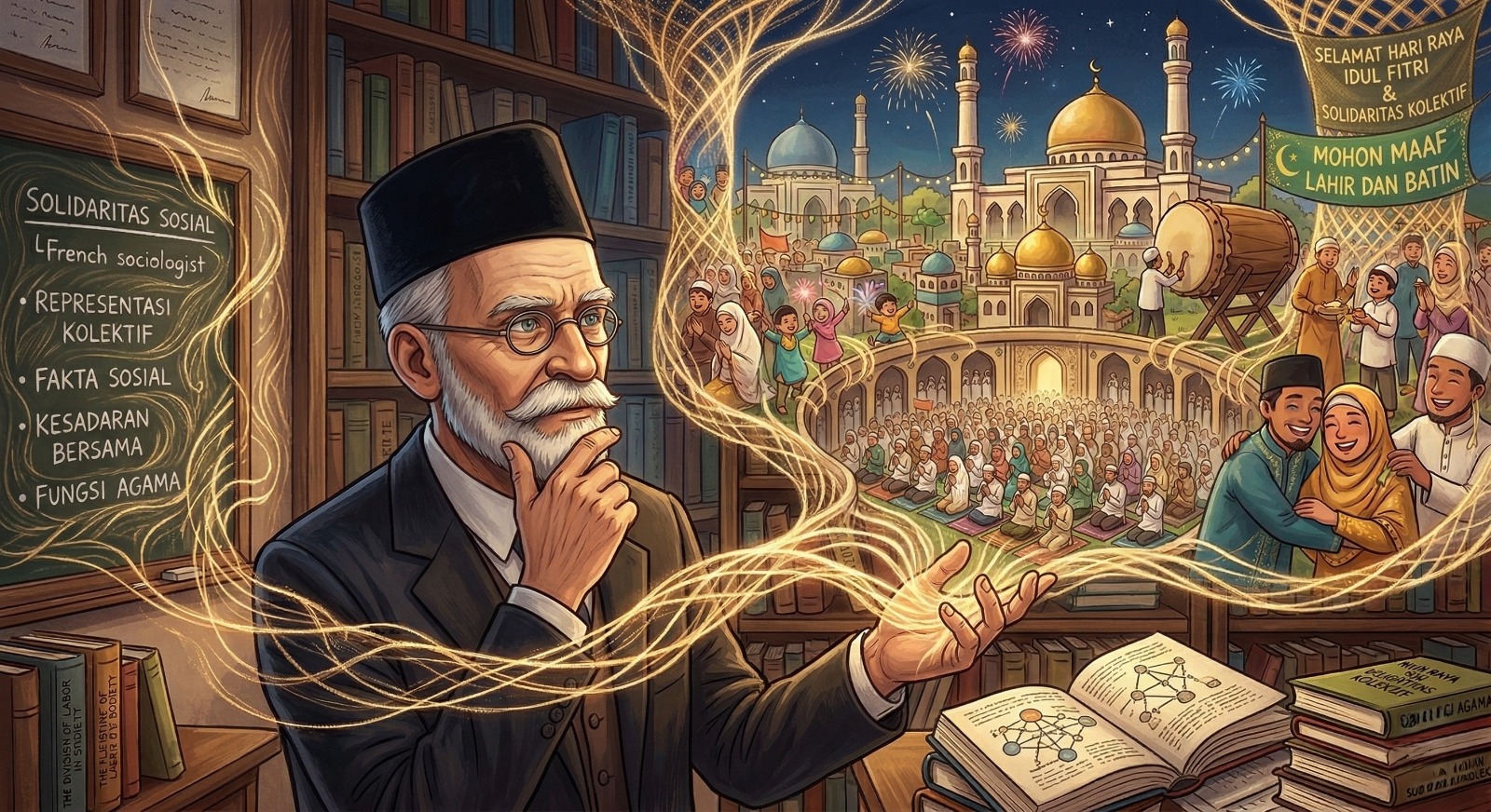 Pagi ini, udara terasa sedikit berbeda. Entah karena sisa hujan semalam yang masih menggantung di dedaunan, atau karena resonansi takbir yang bersahutan dari pengeras suara masjid sejak tenggelamnya matahari kemarin. Sambil merapikan lengan baju yang sedikit lecek karena setrikaan terburu-buru, tanganku meraih sebuah kerudung hitam di atas meja kamar. Warnanya sudah agak kusam di bagian ujung, tanda bahwa ia lebih sering tergencet di dalam tas ransel daripada melilit di kepala di kepala. Saat mematut diri di depan cermin, sebuah pikiran ganjil tiba-tiba melintas. Bagaimana jika pagi ini, perayaan Idul Fitri yang terasa begitu sakral dan melangit ini, kita bedah sejenak menggunakan kacamata seorang sosiolog Prancis berjanggut lebat dari abad ke-19, Emile Durkheim?